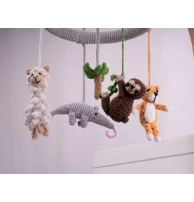 Sindibaba49,90 €Le mobile bébé en Crochet "Amérique du Sud" captera l'attention de votre bébé. Conçu pour la décoration de la chambre d'enfant, il est fabriqué à la main dans les conditions du commerce équitable. Votre bébé pourra regarder les personnages tourner ou vous écouter et regarder secouer les petits animaux (jaguar, fourmilier, lama, paresseux) qui disposent tous d'un petit hochet intégré. Le mobile est idéal pour éveiller les sens de bébé dès sa naissance mais également pour le calmer et l'endormir.