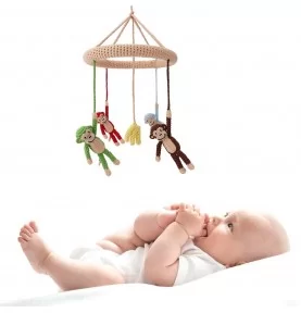 Sindibaba49,90 €Le mobile bébé en Crochet avec singes et bananes captera l'attention de votre bébé. Conçu pour la décoration de la chambre d'enfant, il est fabriqué à la main dans les conditions du commerce équitable. Votre bébé pourra regarder les personnages tourner ou vous écouter et regarder secouer les petits singes qui disposent tous d'un petit hochet intégré. Le mobile est idéal pour éveiller les sens de bébé dès sa naissance mais également pour le calmer et l'endormir.